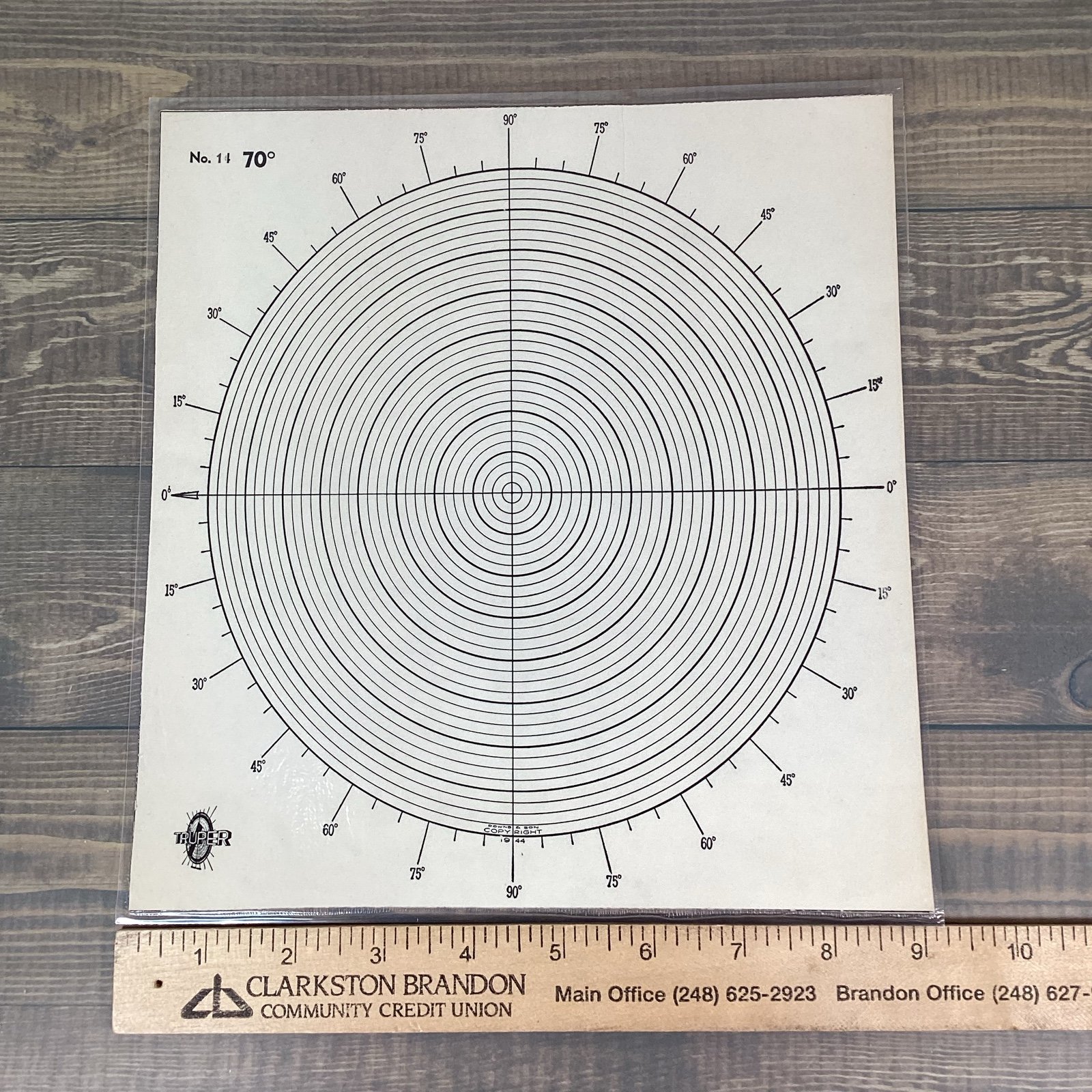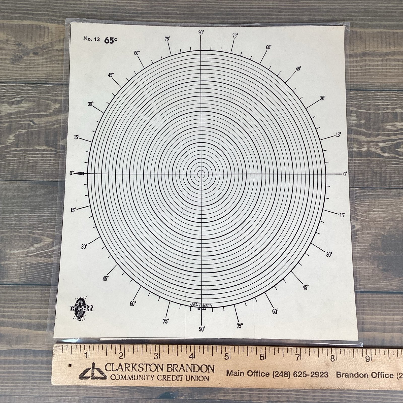 Rare 8 sheets of Truper graphing paper with tilt perspective. Each sheets has been laminated and is marked Downs & Sons Copyright 1944. Each sheet has a different degree perspective showing the graph from a viewing angle, ie 5° looks as though you are looking at a steep angle - 5° from the plane. Unknown what the original purpose of these unique graphs were. The 80° sheet has an original corner torn before it was laminated.